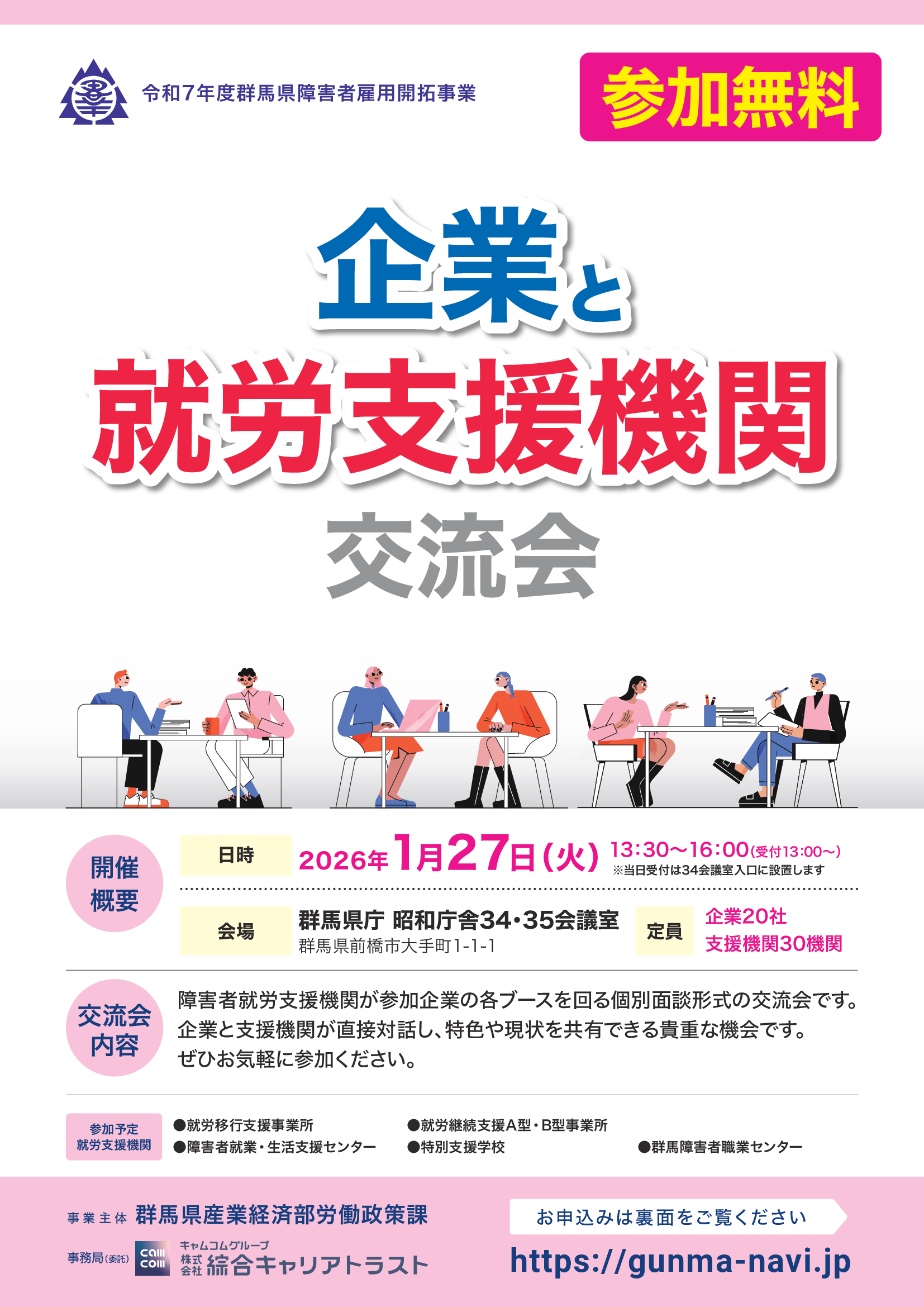 お申込みからの流れ ① HPからご希望の日時など簡単な項目を入力してお申し込み 電話、FAXでも申し込みOK!(運営スタッフが必要事項をお伺いします) ▼ ②事務局からお申し込み確認メールが届く ▼ ③当日参加 詳細は1週間前を目途にメールにてご案内 お申し込み・お問い合わせはこちら 法人名(必須) 部署 役職 お名前(必須) 所在地(必須) 電話番号(必須) メールアドレス(必須) 参加人数(必須) ---1人2人3人4人以上 障害者採用のハローワーク求人票 出していない出している 障害者雇用実績 ないある 参加にあたりご意見などあればご記入ください 定員になり次第、参加申込みを締め切らせていただきます。ご了承ください。 当日の詳しい内容は開催日が近づきましたら改めて連絡いたします。 お申し込みいただいた方には、参加予定企業・機関の一覧を令和8年1月上旬頃に共有予定です。 【個人情報の取り扱いについて】 1. 申込用紙に記載されたお客様の情報は、セミナーのご案内といった活動等に使用することがあります。)ご案内は代表者様宛にお送りすることがあります)法令で定める場合のほか、お客様の承諾なしに他の目的には使用致しません。 2. お客様の情報管理につきましては株式会社綜合キャリアトラストで管理致します。 3. セミナーのご案内時にいただきました住所・貴社名・ご担当者氏名を株式会社綜合キャリアトラストが個人情報の管理について事前に調査した上で契約しましたダイレクトメール発送代行会社に発送データとして委託することがございます。 4.必要となる情報(会社名・氏名・電話番号)をご提供いただけない場合は、お申し込みのご連絡や受講票の発送などができない場合がございます。 送信内容を確認してチェックしてください。